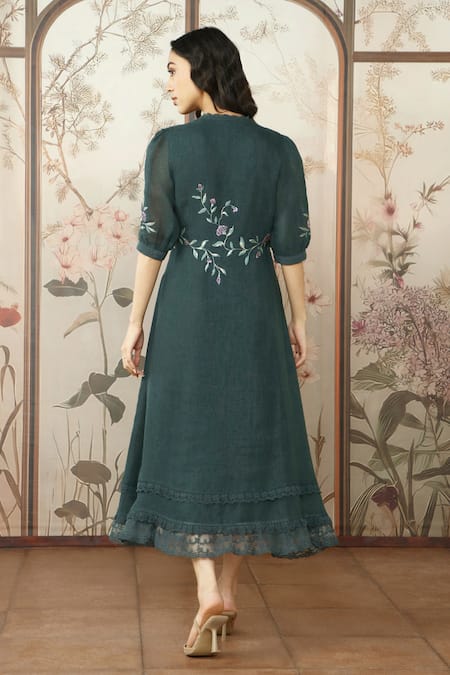 Forest green dress featuring dahlia flowers and trails of vine embroidered in thread and crystal work