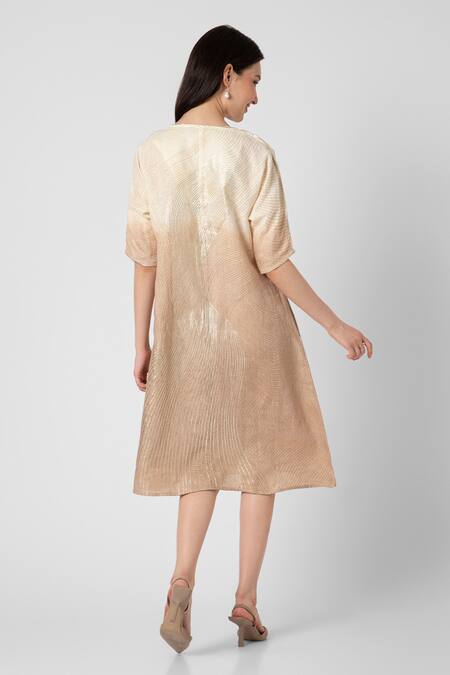 Beige ombre dyed midi dress featuring foil and hand screen printing