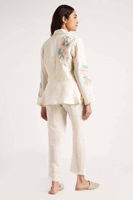 Off white blazer featuring floral corsage embroidery with silk threads and gold foil work. Paired with a straight pant and inner top.