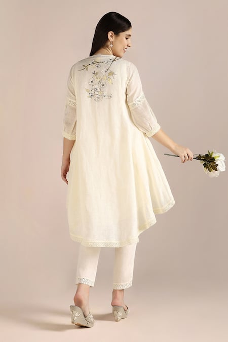 Off White 100% Linen Hand Print Floral Round Neck Tunic And Pant Set