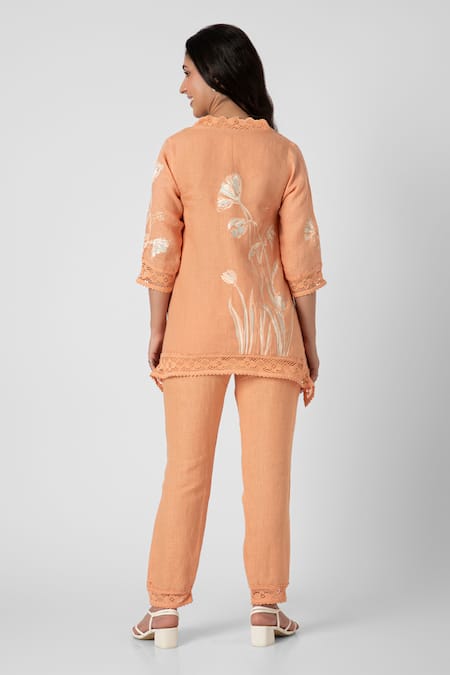 Orange 100% Linen V Neck Floral Oil Painted Top And Pant Set