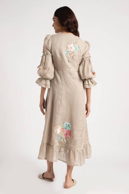 Grey midi dress featuring floral silk embroidery with a ruffled hem