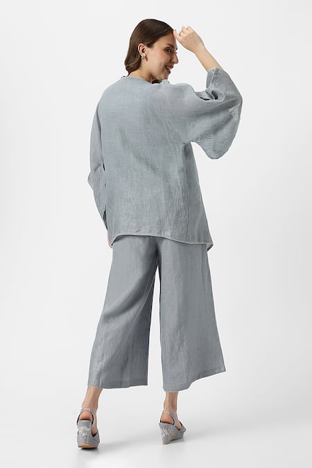 Shadow blue flared jacket featuring open neck and bell sleeves. Paired with a coordinating top and flared pant.