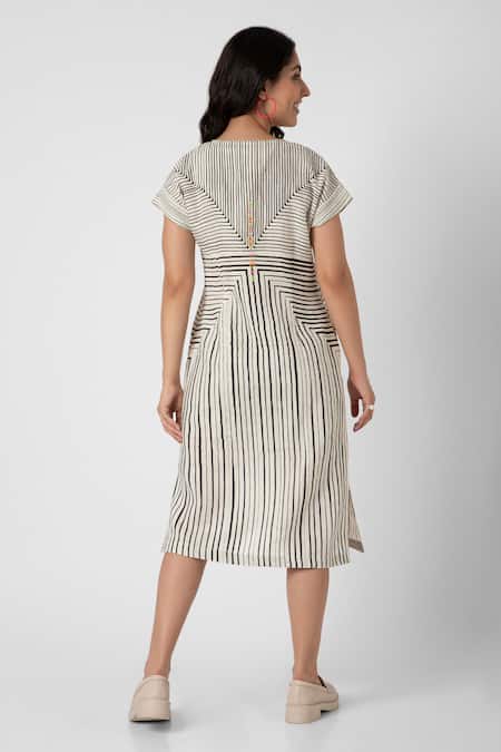 Beige and white midi dress featuring a V neck and short sleeves