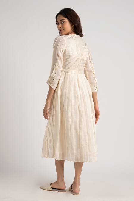 Off White Linen Embroidery Round Neck Illusion Amanda Printed Dress