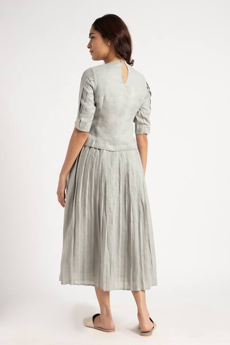 Green top featuring half sleeves, round neckline, and floral hand screen printed motifs. Paired with a matching pleated skirt of 100% linen fabric.