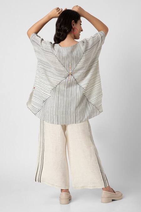 Beige striped top featuring a V-neckline and half sleeves. Paired with relaxed fit flared pants in white linen.