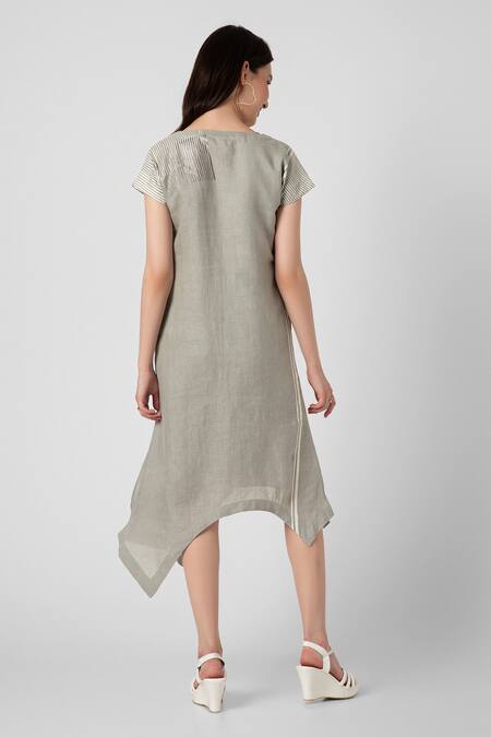 Fern asymmetric V neck dress crafted from 100% linen featuring a unique brick placement print