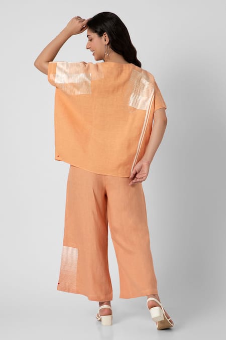 Orange top in 100% linen featuring a V neck and half sleeves with brick and linear placement prints. Paired with wide-leg pants that complement the top's design.