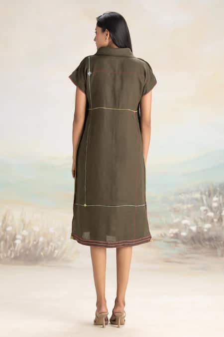 Avocado linen dress featuring a round roll collar and extended sleeves