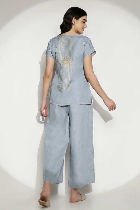 Blue top featuring round neckline, cap sleeves, and zari thread embellishments in a leaves pattern