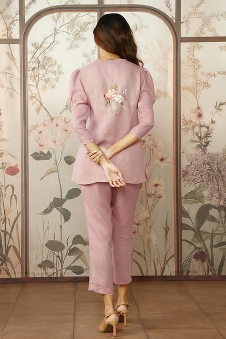 Pink 100% Linen Embroidered Cotton Thread Mandarin Peony Parade Top With Pant