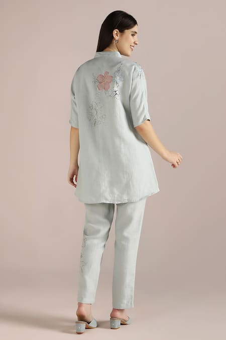 Blue Linen Embroidery Collared, Split Poppy Jane Floral Pattern Top With Pant