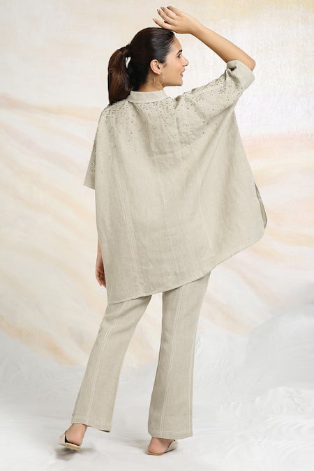 Grey boxy top featuring a notched collar, half sleeves, and rhinestone embellishments. Paired with matching pants designed in 100% linen fabric.