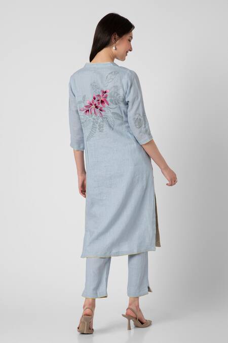 Ice blue kurta featuring a notched neckline and three-quarter sleeves with contrast detailing and hand screen print. Paired with matching pants for a coordinated look.