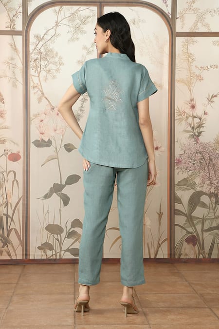 Buy_Kaveri_Blue Linen Studs V-neck Starlight Wave Embellished Top With Pant _Online_at_Aza_Fashions