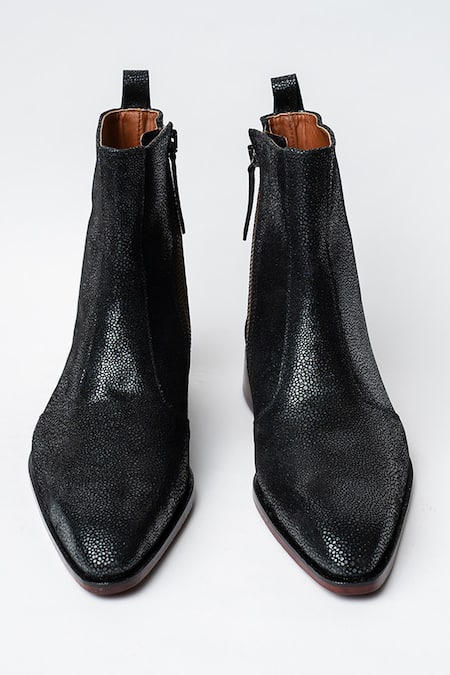 Black cowboy ankle boots featuring a square pointed toe and trapezoid heel