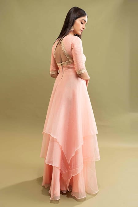 Rose gold organza layered anarkali with zardozi embroidered yoke. Comes with blouse.
