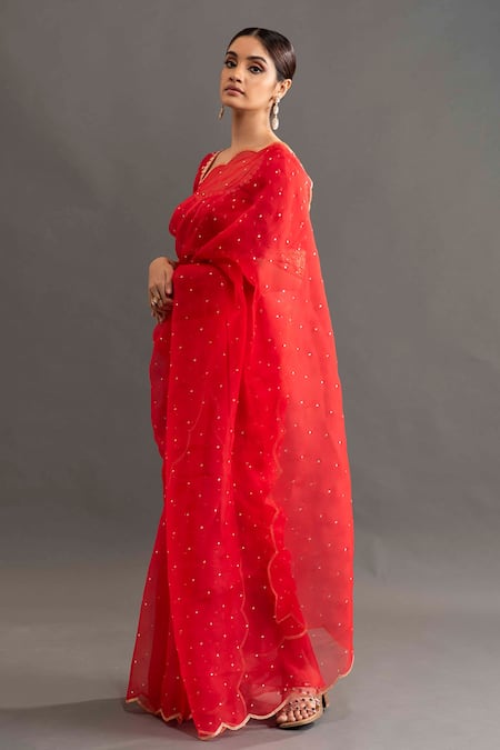Red organza saree with all over buttis & scalloped zari border. Comes with embroidered blouse.