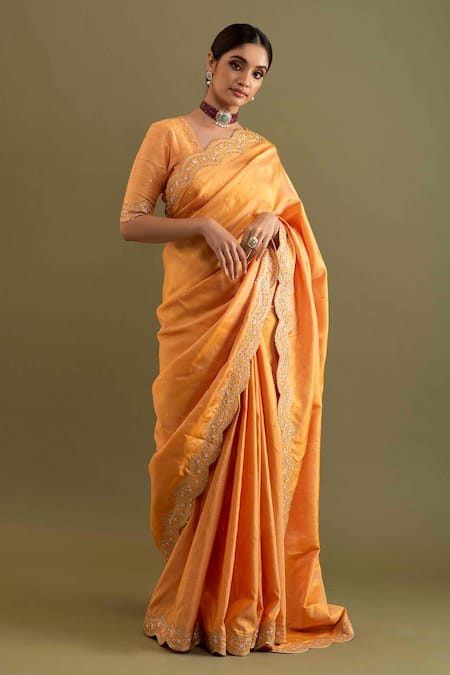 Mustard yellow silk scallop embroidered saree. Comes with blouse.