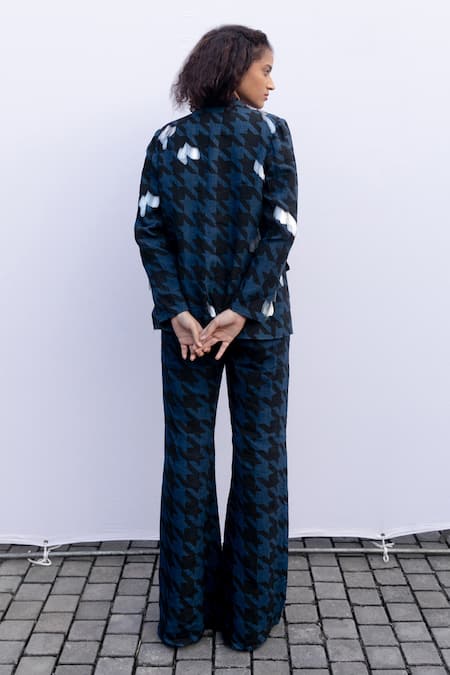 Black and blue houndstooth printed blazer with drop sequins. Paired with matching bell bottom pants featuring a boot-cut design and side pockets.