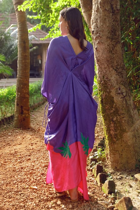Purple kaftan crafted from handwoven mulberry silk featuring a V neck and three quarter sleeves