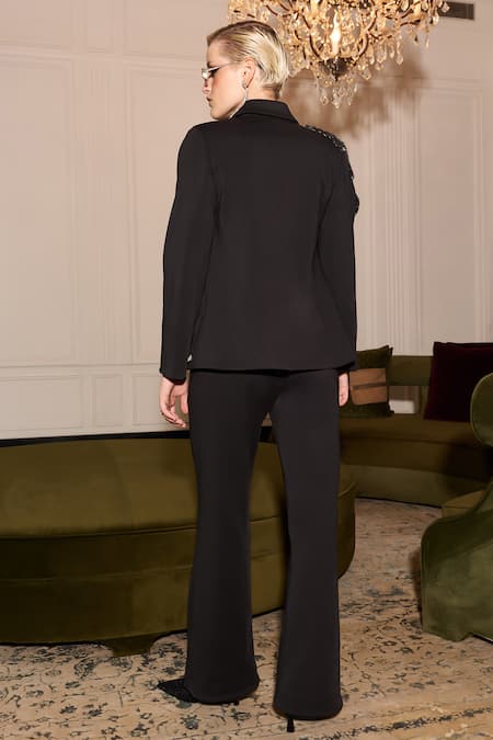 Black Neoprene, Polyester Stones 3d Flower Embellished Blazer And Pant Set