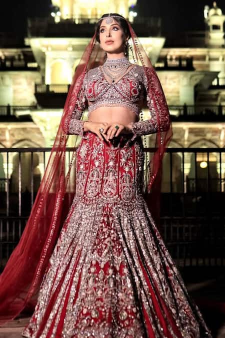 Red lehenga featuring intricate zircon, sequin, and crystal embroidery. Paired with an embroidered blouse with tasseled hem and an embroidered veil.