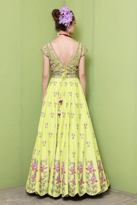 Mehendi green lehenga with all-over fuchsia pink floral embroidery. Comes with blouse.
