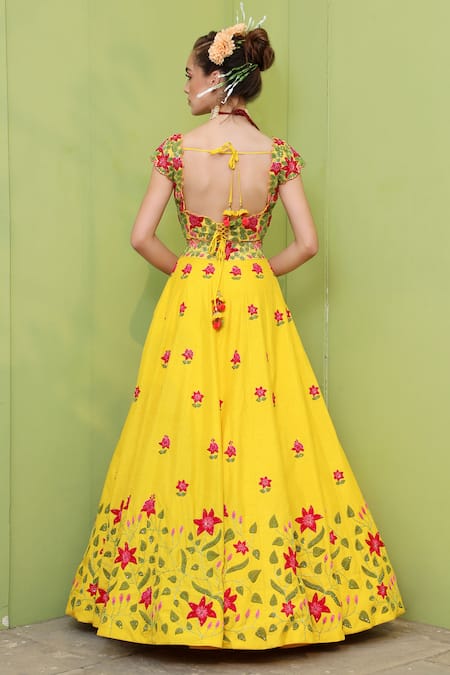 Yellow blouse with all-over floral embroidery, cutwork square neckline and cap sleeves. Comes with lehenga.