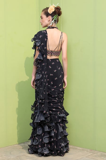Black pre-draped saree with all-over floral print and ruffle hem. Comes with embroidered blouse.