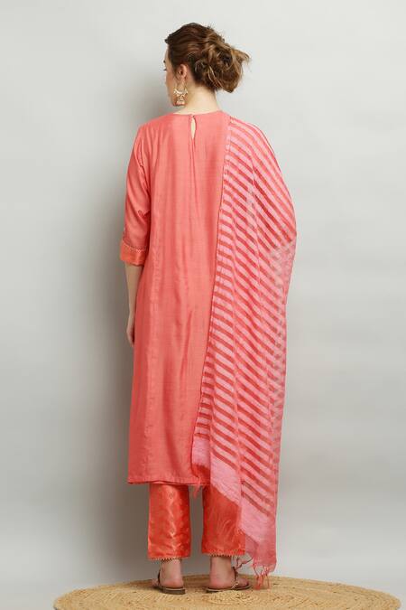 Peach kurta featuring floral resham embroidery, gota cut work lace details & round neck. Paired with dola silk pant and striped lurex dupatta.