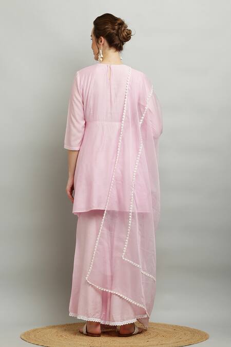Baby pink cotton chanderi short anarkali featuring floral pattern resham embroidered yoke and crochet lace work details. Paired with a gharara and organza dupatta with crochet lace border details.