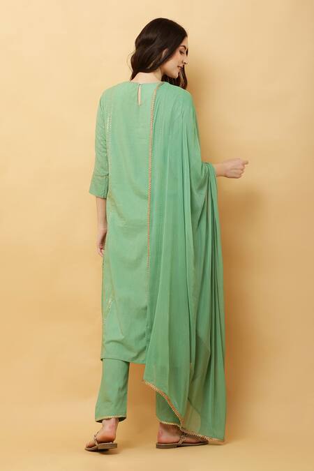 Green Cotton, Chiffon Lace Round Neck Amrique Stripe Placement Woven Kurta Set