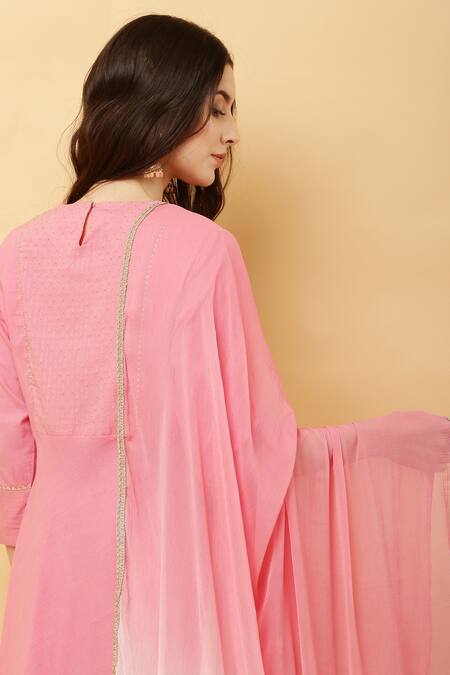 Pink V neck anarkali featuring stripe placement woven motifs on the yoke. Paired with a chiffon dupatta and cotton lurex pant.