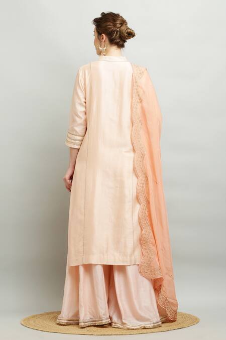 Peach silk chanderi kurta featuring a mandarin collar, three-quarter sleeves, and stitchline embroidery. Paired with a matching sharara and an organza dupatta with scallop borders.