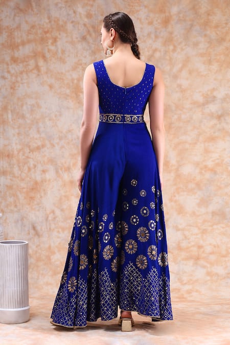 Royal blue sleeveless jumpsuit featuring zari thread and sequin embroidery in a floral pattern