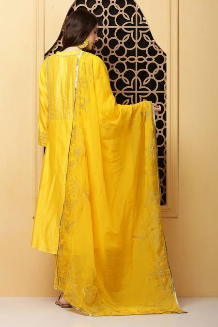 Yellow silk chanderi kurta featuring a V neck and long sleeves with stripe embroidery on the yoke. Paired with a matching sharara and an organza dupatta adorned with floral embroidery and a fringe border.