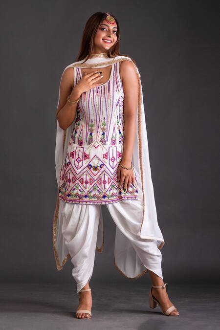 White kurta featuring intricate beaded embroidery and a round neckline. Paired with a viscose crepe dhoti pant and a matching dupatta.