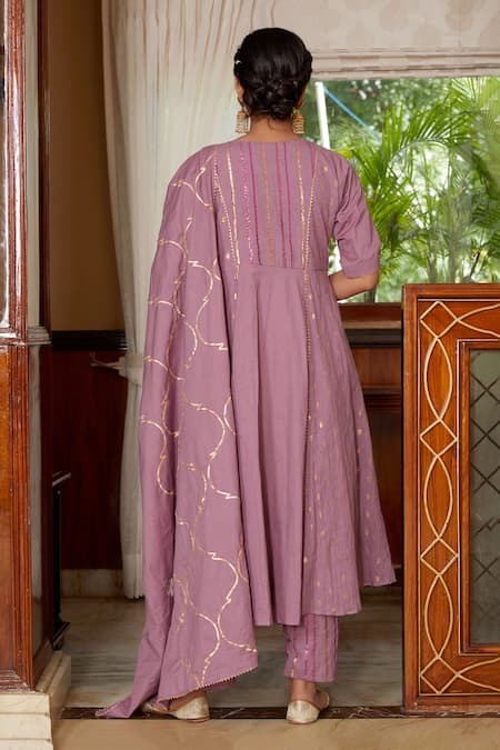 Purple Cotton Gota Patti, Embroidery Round Neck Iris Striped Woven Anarkali Set