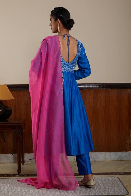 Blue silk chanderi anarkali featuring round neck, sequin, pearl, zari & thread embroidered yoke. Paired with a straight fit pant and contrast silk organza dupatta with scalloped embroidered border.