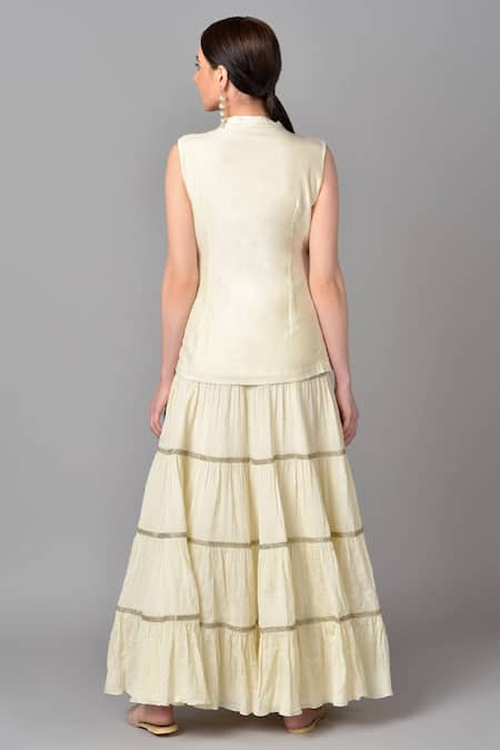 White Chanderi Silk, Cotton Chiffon V Neck Tunic Lehenga Set