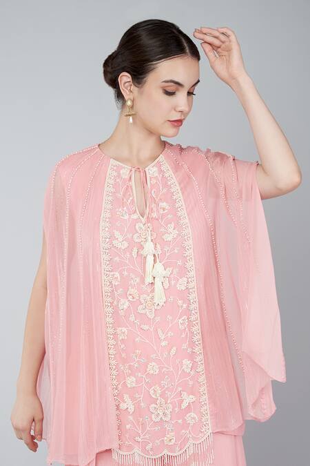 Blush pink cape tunic featuring a floral sequin embellished panel with tie-up details. Paired with a double-layer georgette palazzo.