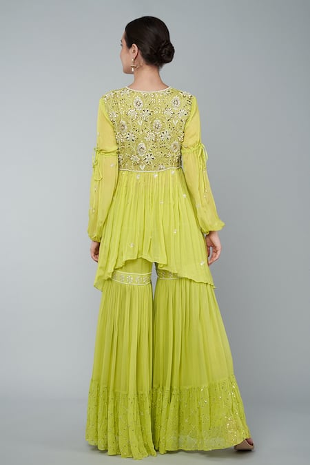 Yellow tunic featuring floral bead embellishments, gathered details, and a V neckline. Paired with an embroidered band gharara with ruffle hem and attached lining.
