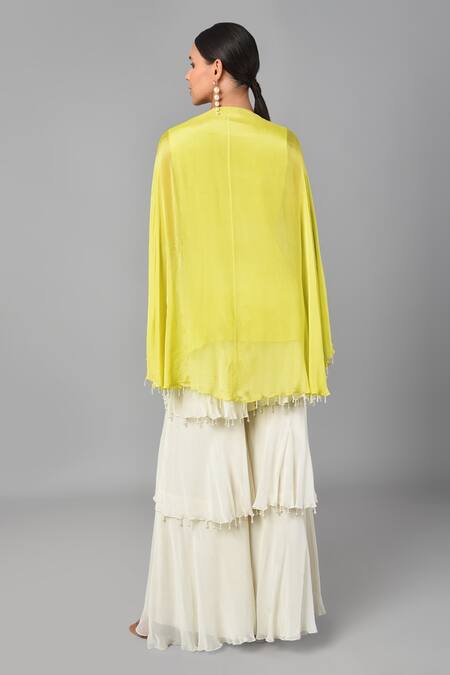 Green tunic with bugle beads and flared sleeves. Comes with ivory tiered palazzo pants.