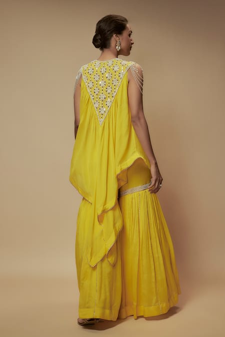 Yellow asymmetric tunic featuring sequin bead floral motifs on the yoke and pearl embellished tiers. Paired with a pearl lined panelled gharara and an inner slip.