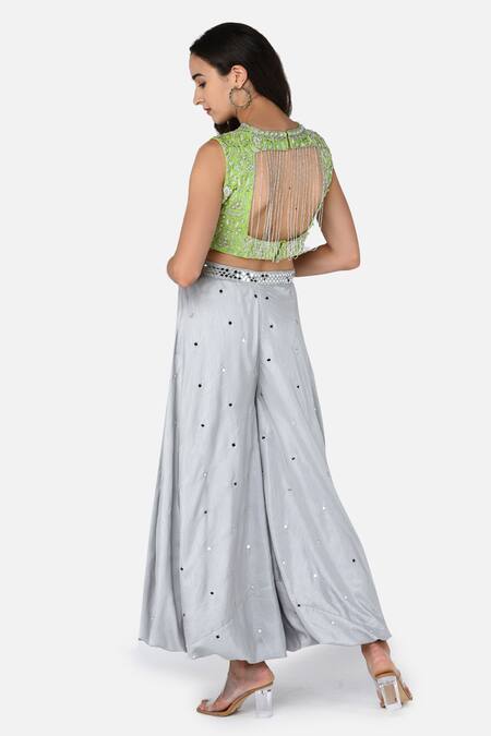 Mint green crop top in silver zardozi embroidery, silver tassel detail. Paired with silk balloon pant with silver mirror embroidery.