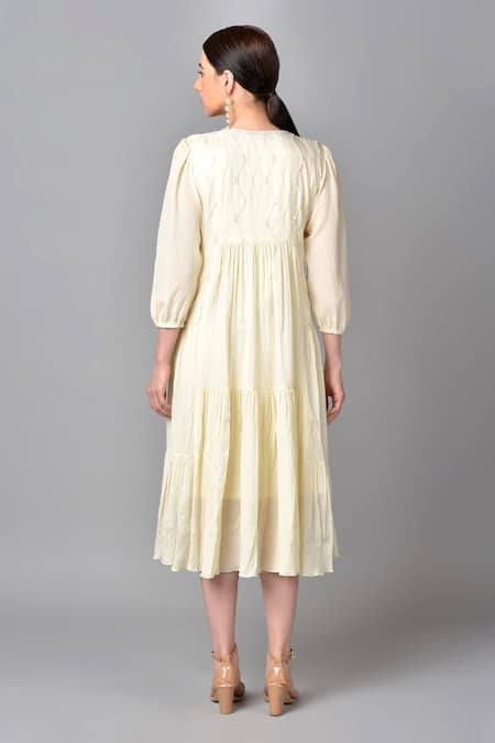 Ivory tiered dress with mirror, floral embroidered motifs & front tassel tie-up. Paired with inner.
