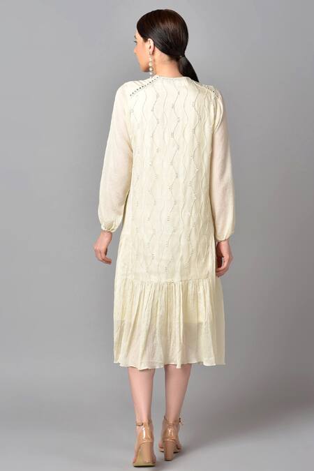 Ivory tiered dress with mirror, floral embroidered motifs & front tassel tie-up. Paired with inner.