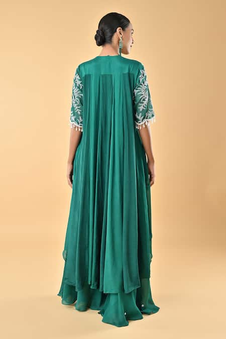 Green silk organza tunic featuring intricate floral embroidery and a front placket. Paired with a matching palazzo adorned with embellishments.